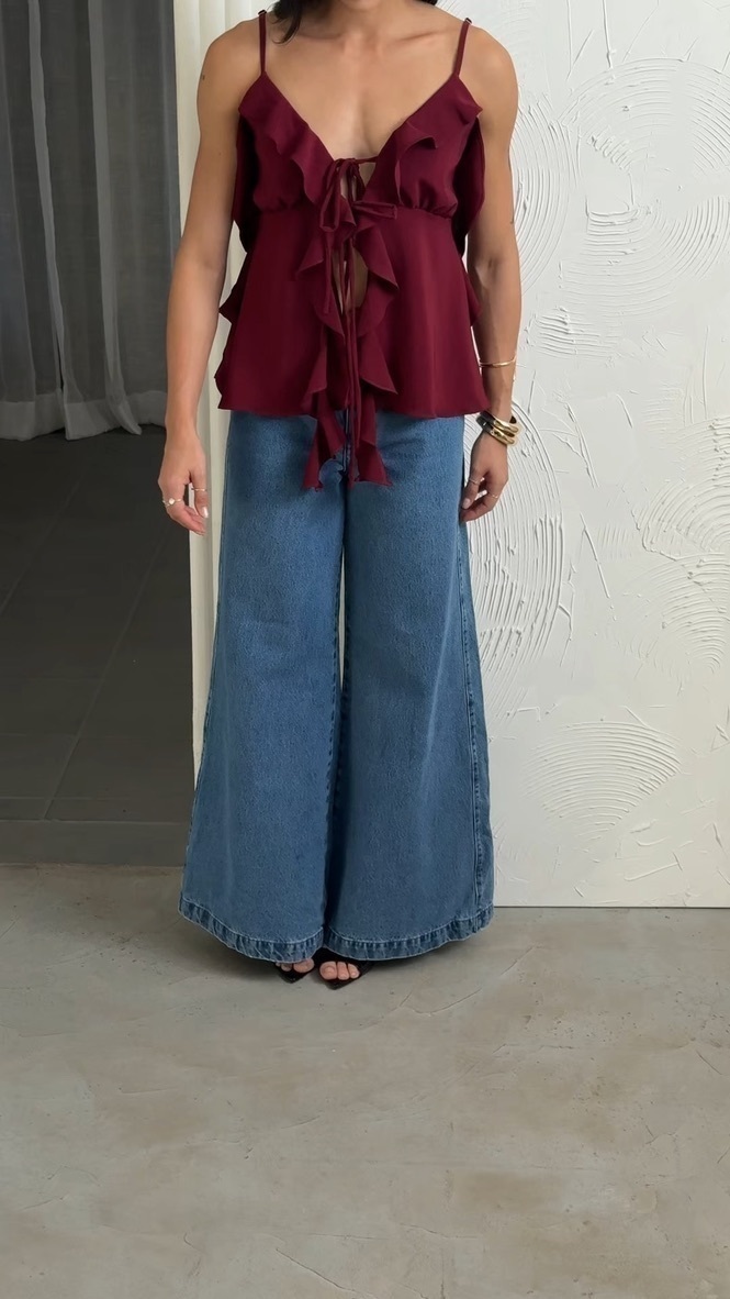 Com um design delicado, ela combina fluidez e feminilidade na medida certa. O decote em V é suavizado por babados, enquanto as amarrações frontais criam um ponto de interesse que valoriza o colo com leveza.